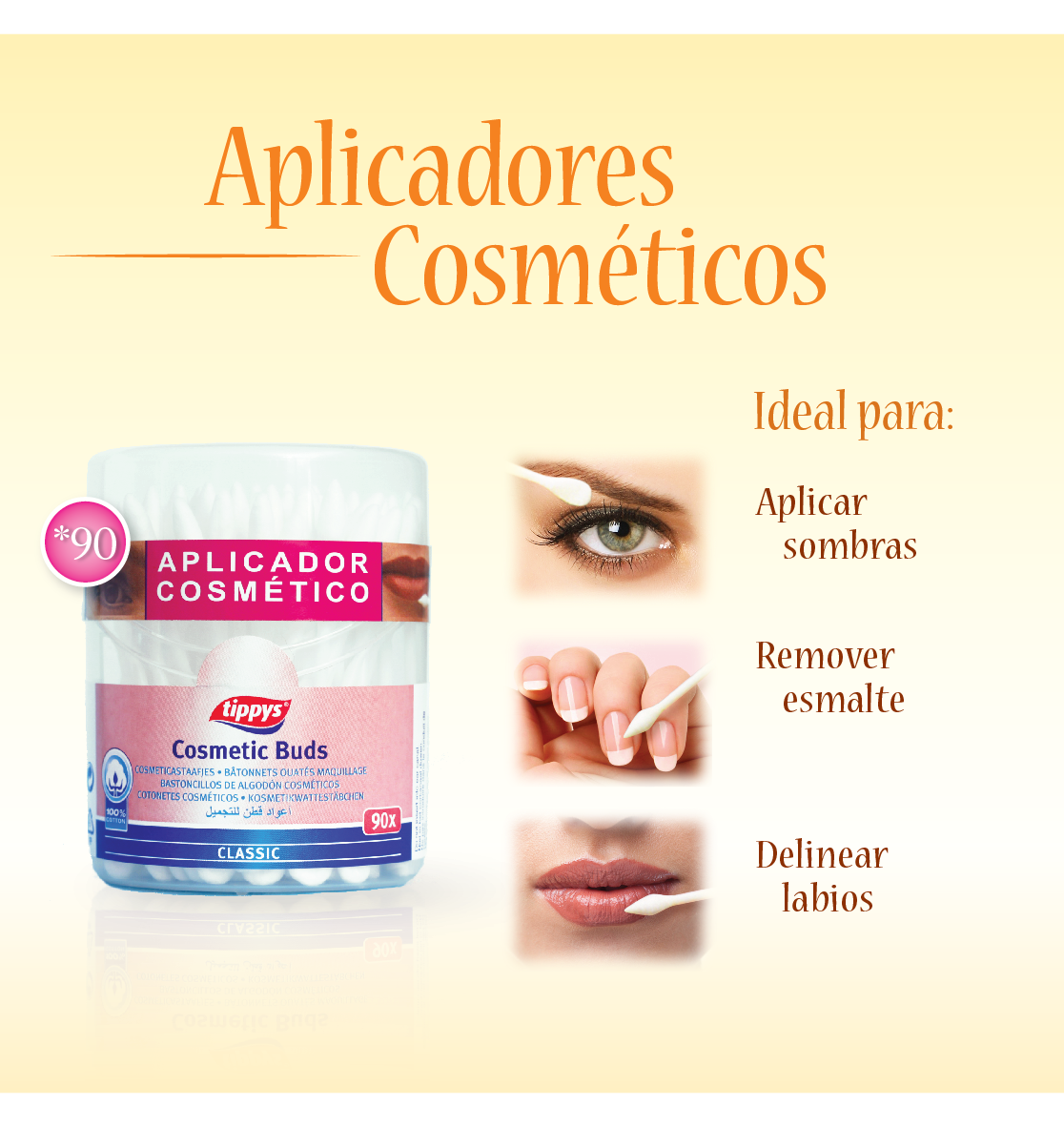 Pensando en una solución rápida y efectiva para la mujer moderna, Tippys ha creado el innovador Aplicador Cosmético, sus extremos de algodón, tanto de punta fina como plana, proporcionarán a cada aplicación un toque suave y delicado así como resultados de belleza óptimos e higiénicos.