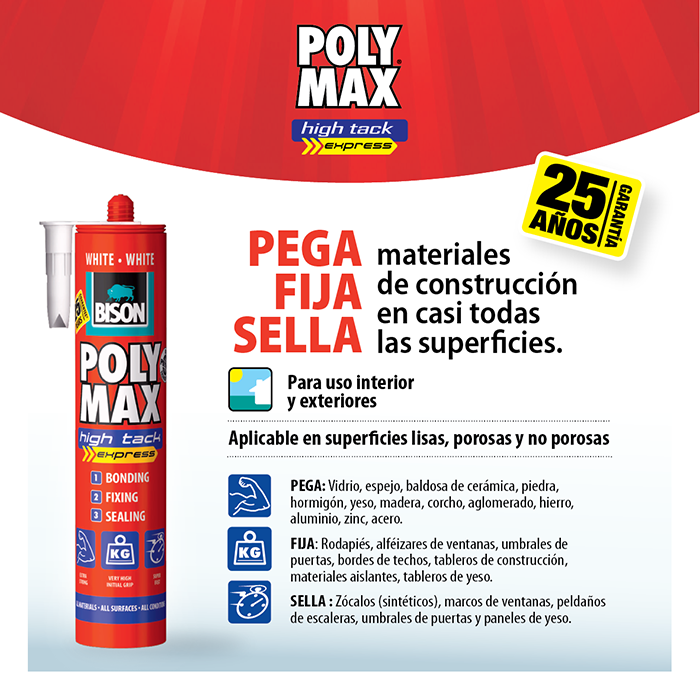 PolyMax High Tack, es apropiado para pegar, fijar y sellar firmemente todo tipo de material de construcción, superficies suaves porosas y no porosas, incluso bajo el agua.
